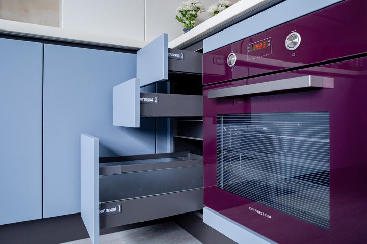Кухня получилась «воздушной», но, вместе с тем, притягательной. За лёгкость здесь отвечает бархат фасадов и их нежная цветовая палитра. А притягательные акценты умело выставлены с помощью техники! Взгляните, в каких сочных цветах выполнены фильтр для воды, духовой шкаф и миксер! Словно яркие штрихи на монохромном полотне они попадают точно в фокус Вашего внимания. И помогают при этом постичь глубину всей композиции!