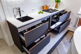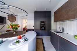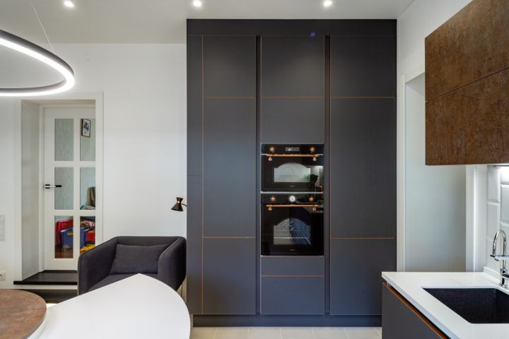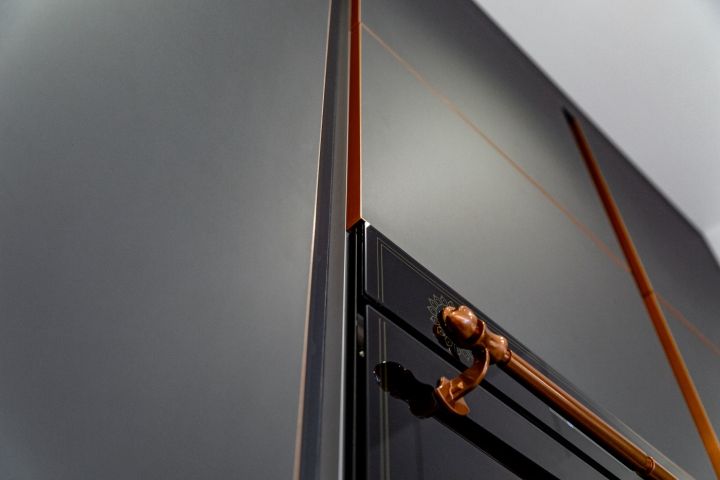 Нижний ярус этой кухни, а также зона с духовкой, холодильником и СВЧ выполнены в благородном графитовом цвете. Фасады из МДФ имеют уникальные декоративные кромки «под медь». Они подчёркивают строгую геометрию модели и придают ей особую энергетику. Кухня будто сияет изнутри тёплым, согревающим пламенем.