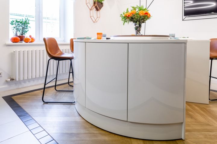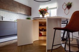 Ну и, наконец, жемчужина всей композиции – огромный круглый остров со съемной центральной частью. Он служит хозяевам и обеденной зоной, и местом для хранения множества полезных мелочей. Для самых маленьких членов семьи здесь тоже приготовлен приятный сюрприз. Центральная зона острова – это еще и уютный детский домик, внутри которого можно играть и хранить любимые игрушки.