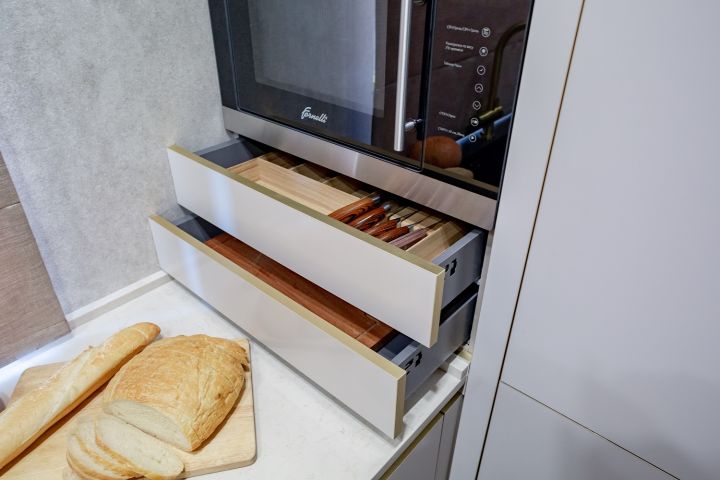 Зона 2 – надёжность камня. Взгляните на второй ярус над варочной панелью! Фасады там выглядят так, словно созданы из камня. Это решение вносит в интерьер элемент надёжности и мужской энергетики. Глава семейства Михаил объявил эту часть кухни своей и только своей!