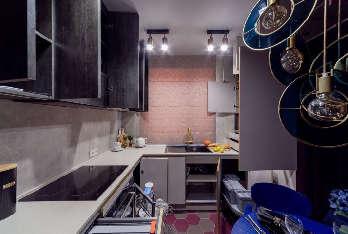 Зона 3 – сочный инжир. Сочности и комфорта хватит на всех! Кухня плавно перемещается в лаунж-зону, продолжаясь в фасадах цвета мякоти инжира. Эта часть комнаты просто создана для того, чтобы встречать гостей и наслаждаться вкусными блюдами!