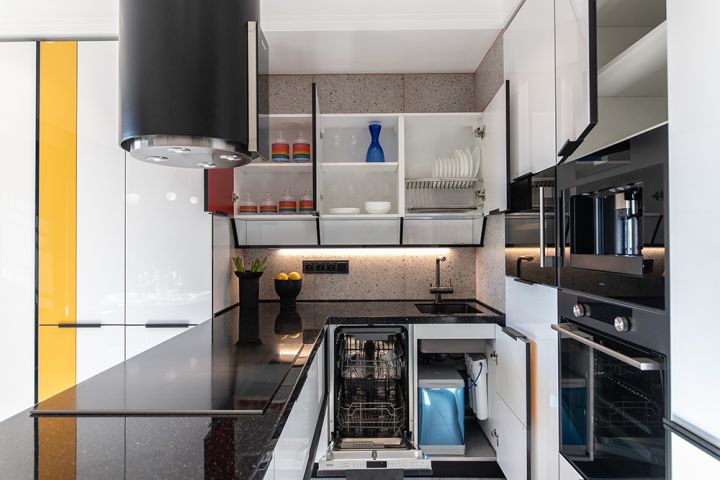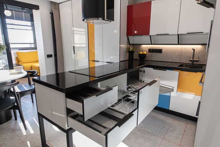 Обставить дом со вкусом – своего рода искусство. Вот почему когда за это дело берутся профессионалы, может получиться шедевр. Примерно так произошло в очередном выпуске передачи «Квартирный Вопрос». Мы сотворили для большой, дружной семьи Давыдовых-Климовых настоящую кухню-картину. Почему «картину»? Потому что, работая над ее обликом, дизайнеры «KD-Lab» вдохновлялись творчеством великого голландского абстракциониста, Пита Мондриана. В его честь кухня и называется – «Мондриана». Давайте взглянем, чем она покоряет сердца!Настоящее произведение искусства – смесь красоты и смелых решений. У «Мондрианы» с этим полный порядок! Ее фасады создаются из МДФ и покрываются высокопрочным ультраглянцем. Ведущий цвет – белый, сочные акценты – красные, синие и жёлтые. Точь-в-точь как на полотнах голландского мастера абстракции! Кромки корпусов и фасадов выполнены в угольно-чёрном цвете, а столешница из искусственного камня – в цвете «звёздная буря». Контрастные кромки дарят кухне цветовую «глубину» и делают ее еще более выразительной.